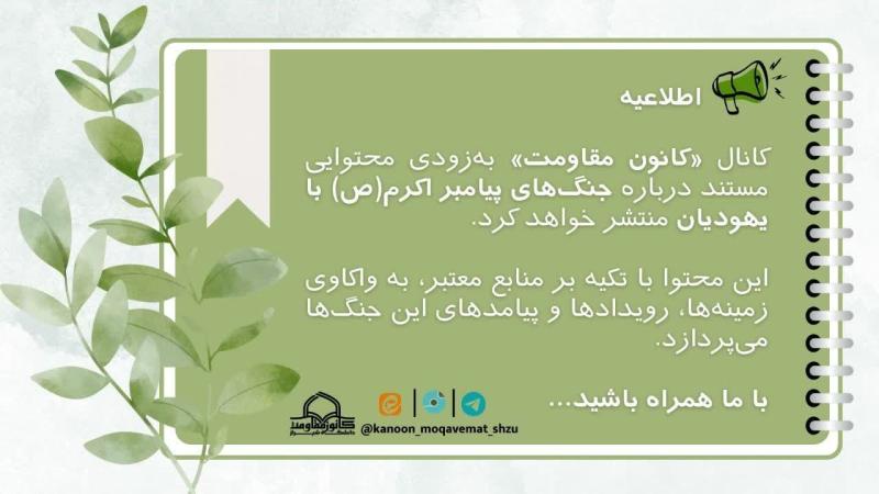 به مناسبت سالروز جنگ پیامبر اکرم‌ (ص) با بنی‌النضیر، در محتوایی تازه از «کانون مقاومت دانشگاه شیراز»  (https://eitaa.com/kanoon_moqavemat_shzu)به بررسی دقیق زمینه‌ها، حوادث و پیامدهای این رویارویی‌ها پرداخته خواهد شد.