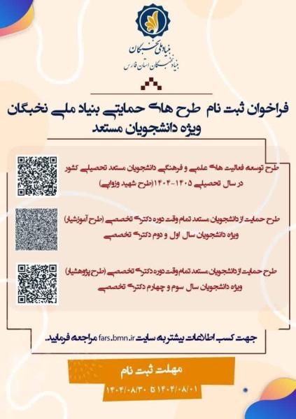 بنیاد نخبگان استان فارس از دانشجویان مستعد تحصیلی برای بهره‌مندی از حمایت‌های علمی، فرهنگی و پژوهشی بنیاد ملی نخبگان در سال تحصیلی 1405-1404 دعوت به ثبت‌نام می‌کند.