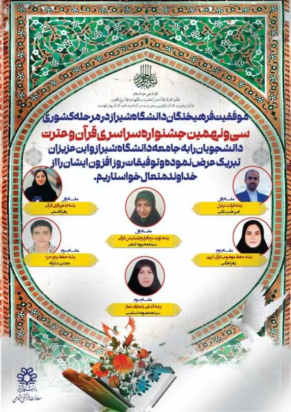 موفقیت شایسته و افتخارآفرین دانشجویان دانشگاه شیراز در جشنواره سراسری قرآن و عترت