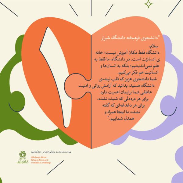 شما دانشجوی عزیز که قلب تپنده‌ی دانشگاه هستید، بدانید که آرامش روانی و امنیت عاطفی شما برای‌مان اهمیت دارد.